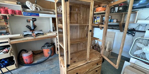 Show off your stuff with a glass display case with storage. This project came from 3 Black Oak Slabs.